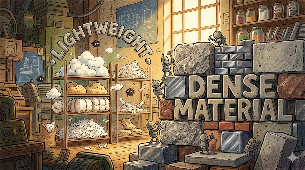 물리학이나 공학, 건축에서 쓰이는 전문적인 표현입니다. 같은 부피(크기)라도 그 안에 입자가 아주 촘촘하게 뭉쳐 있어서 '무게가 무겁고 단단하며 뚫기 힘든(방음이나 방사선 차단에 유리한) 특성을 가진 재료' 를 뜻합니다. 납(lead)이나 콘크리트 같은 물질을 설명할 때 가장 먼저 등장하는 단어입니다.