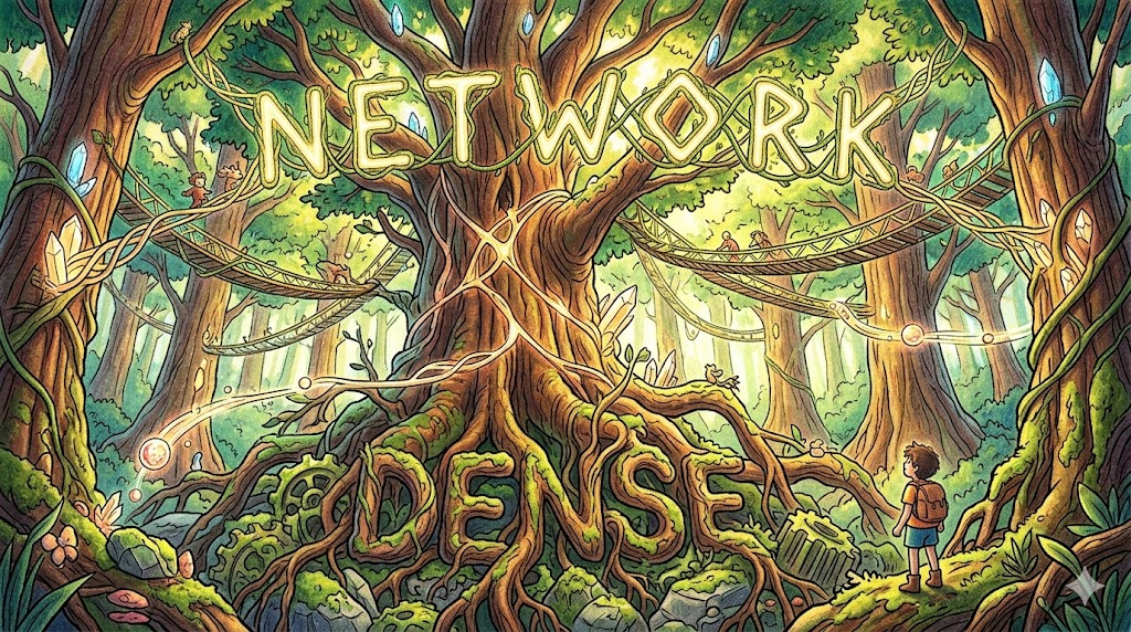 IT 기술, 뇌과학, 혹은 도시 공학에서 아주 흔하게 쓰입니다. 점과 선들이 듬성듬성 있는 것이 아니라, '수많은 연결 고리(노드)들이 좁은 공간에 복잡하고 촘촘하게 얽혀 있는 상태' 를 묘사합니다. 도쿄나 서울의 복잡한 지하철 노선도, 뇌 속의 신경 세포망, 혹은 거미줄처럼 연결된 5G 통신망을 떠올리시면 완벽합니다.