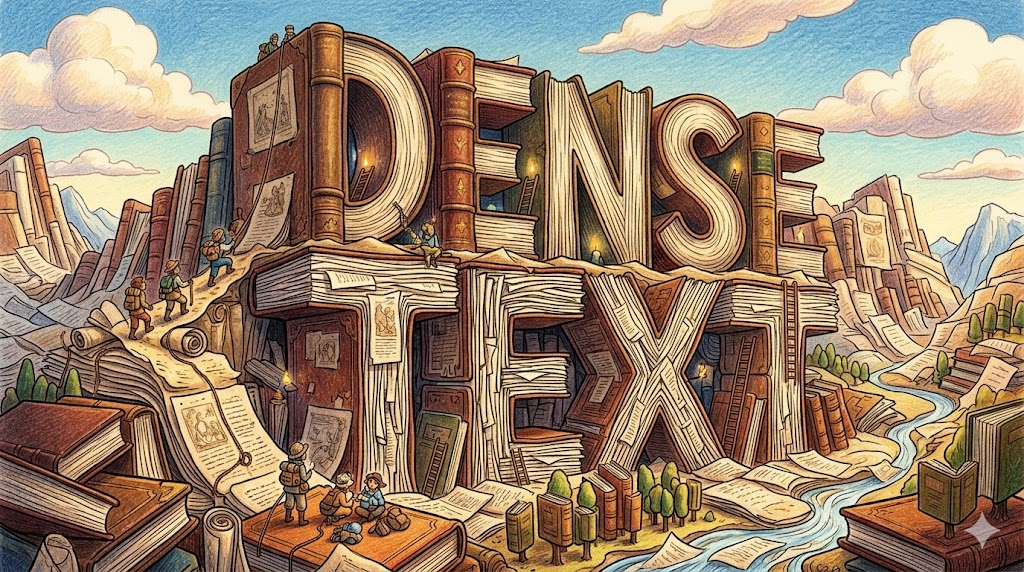 - dense text: 학술 논문이나 철학 책처럼 어려운 단어와 복잡한 개념이 꽉꽉 채워져 있어서 한 번에 '이해하기 힘든(내용이 빽빽한) 글' 입니다.