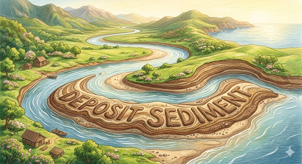 - 해석: (과학/지구과학) 강물이나 바람이 운반하던 모래나 흙(sediment)이 유속이 느려지면서 바닥에 가라앉아 쌓이는 현상입니다.