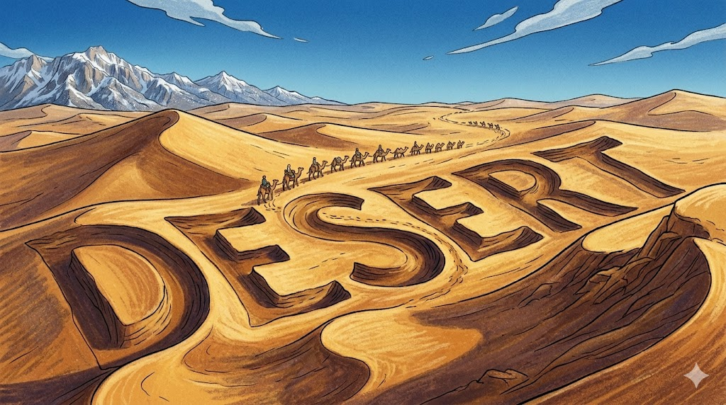- Desert (s 하나): 사막 / 버리다 (어원: '버려진' 곳)