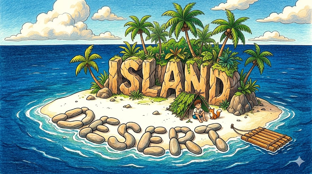 - 해석: (문학/영화) 사람이 살지 않는 외딴섬을 뜻합니다. 주로 고립된 상황이나 생존 게임의 배경으로 묘사됩니다.
