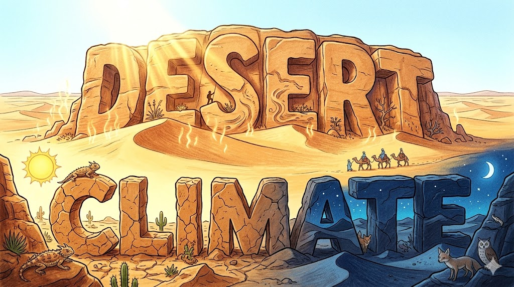 - 해석: (과학/지리) 연 강수량이 매우 적고 증발량이 많으며, 낮과 밤의 기온 차가 매우 큰 기후 특성을 말합니다.
