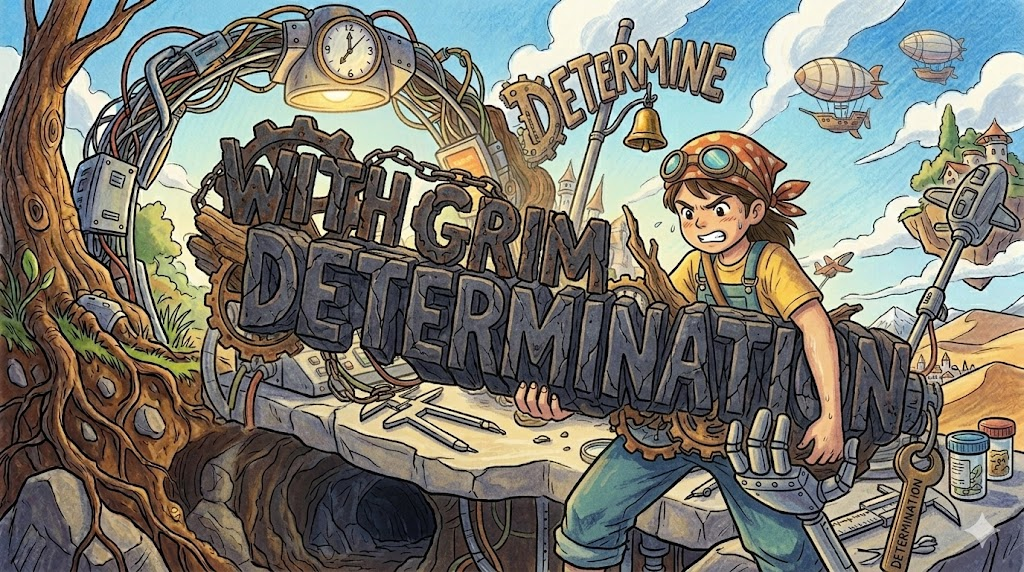 - The team worked with grim determination to repair the damage before the deadline.