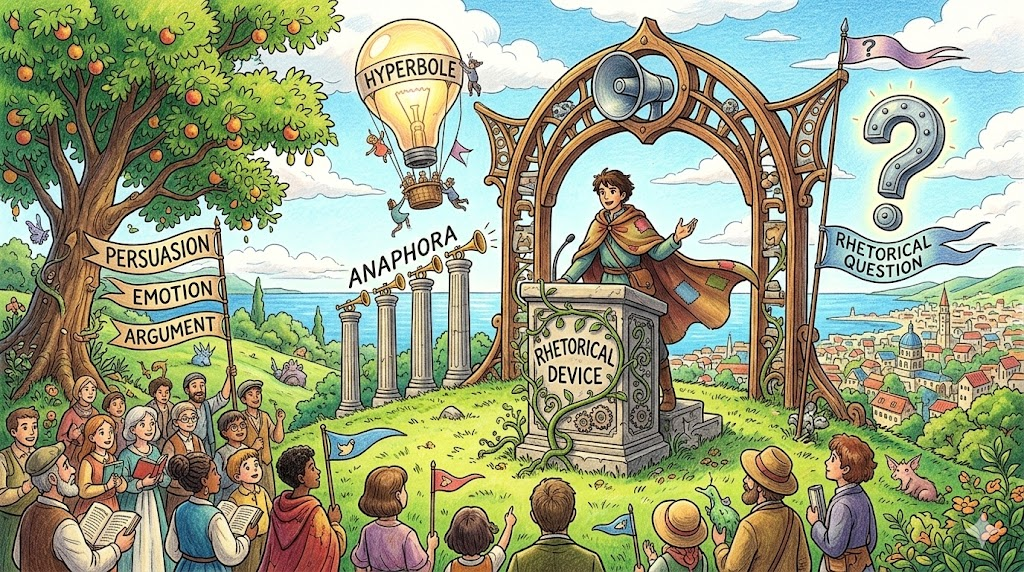 청중이나 독자를 '설득하거나 감동시키기 위해' 문장을 구성하는 기술적인 방법입니다. 정치인의 연설이나 광고 문구에서 자주 볼 수 있습니다. 반복법(anaphora), 과장법(hyperbole), 수사적 질문(rhetorical question) 등이 포함됩니다. 'literary device'가 감상에 초점을 둔다면, 'rhetorical device'는 상대의 마음을 움직이는 '말의 기술' 에 초점이 있습니다.