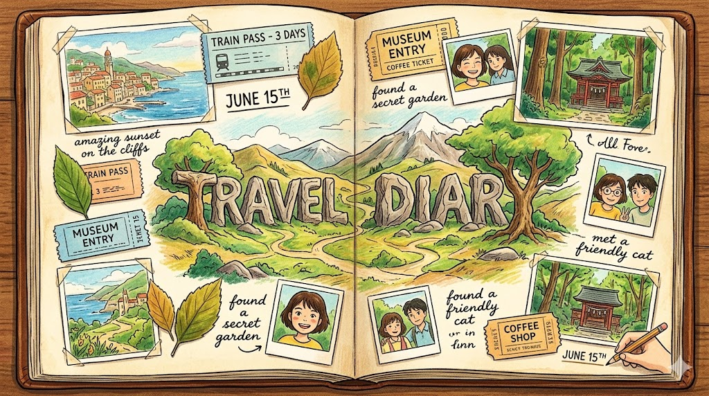 - 해석: 여행 중에 방문한 장소, 먹은 음식, 느낀 점 등을 기록한 일기입니다. 나중에 여행 에세이의 밑바탕이 되기도 합니다.