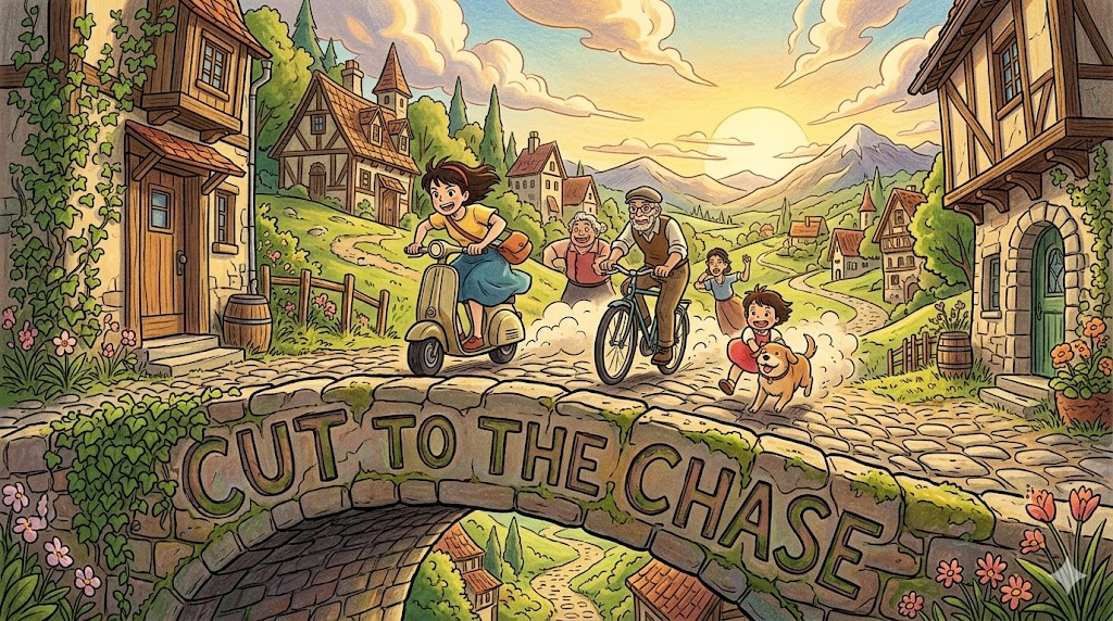 과거 무성 영화 시절, 관객들이 지루한 대화나 배경 설명보다는 긴박한 '추격전(Chase)'을 가장 좋아했던 것에서 유래했습니다. 감독이 지루한 장면을 잘라내고(cut) 가장 흥미진진한 추격씬으로 바로 넘어가듯, 대화에서 '쓸데없는 서론은 빼고 핵심(본론)만 바로 말하자' 고 할 때 쓰는 아주 대표적인 표현입니다.