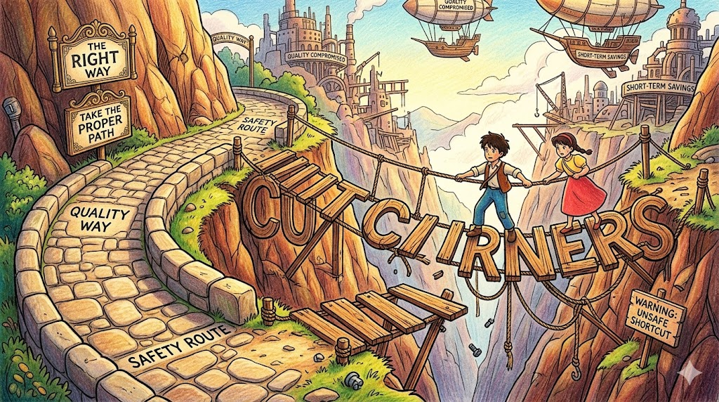 - We shouldn't cut corners when building a bridge. (다리를 지을 때 절차를 무시하고 대충해서는 안 된다.)