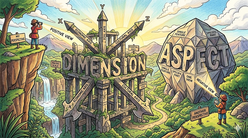 | 종합 뉘앙스 | (1) 물리적인 '길이·너비·높이'. (2) 수학·과학의 '차원'. (3) 문제의 복잡한 '측면'. | '세상을 구성하거나 측정하는 요소' |