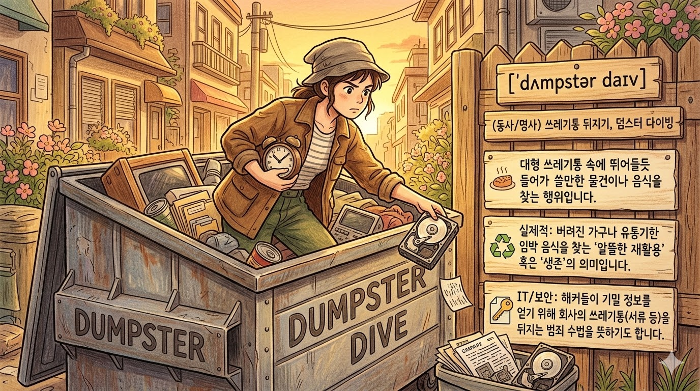 - 해석: 식당이나 마트 뒤편의 대형 쓰레기통(dumpster)에 몸을 던져 쓸 만한 물건이나 버려진 음식을 찾아내는 행위입니다. 현대에는 극단적인 절약이나 환경 보호(Freeganism)의 일환으로 행해지기도 합니다.
