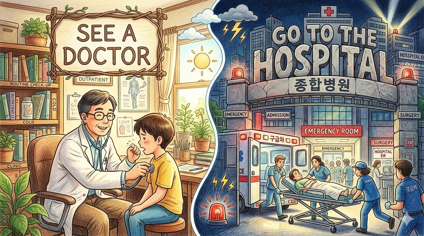 한국어로는 감기에 걸려도 "병원에 간다"라고 하지만, 원어민에게 "I need to go to the hospital"이라고 하면 앰뷸런스에 실려 가는 응급 상황이나 중증 수술을 떠올립니다. 가벼운 증상일 때는 반드시 "see a doctor" 나 "go to the clinic" 이라고 표현해야 자연스럽습니다.
