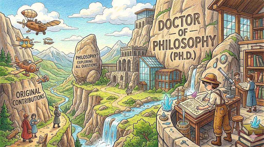- *Doctor of Philosophy (Ph.D.) 는 학계에서 수여하는 최상위 학위입니다. 단순히 공부를 많이 했다는 증명을 넘어, 인류의 지식 체계에 '새로운 벽돌 하나를 얹었다' 는 것을 공식적으로 인정받는 과정이죠.