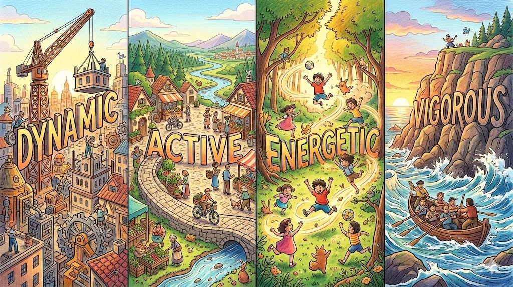 유의어 비교: 활동적이고 에너지 넘치는 상태를 뜻하는 단어들 (Dynamic vs. Active vs. Energetic vs. Vigorous)