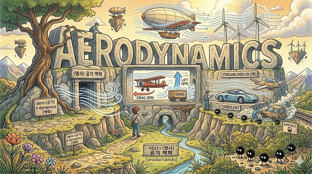 - aerodynamics: 공기(aero)와 역학(dynamics)의 합성어로, 비행기나 자동차가 움직일 때 공기의 흐름과 저항이 어떻게 작용하는지 연구하는 '공기역학'입니다.