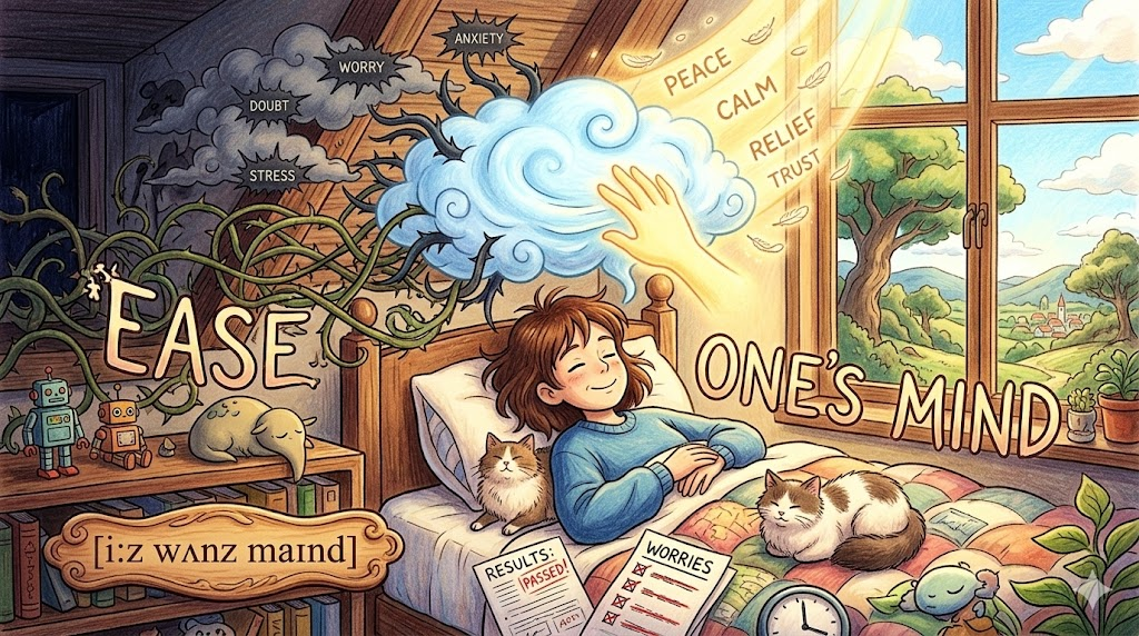 - ease one's mind: 머릿속을 맴도는 걱정거리나 의심을 덜어내어 '마음을 놓다(안심시키다)'라는 뜻입니다.