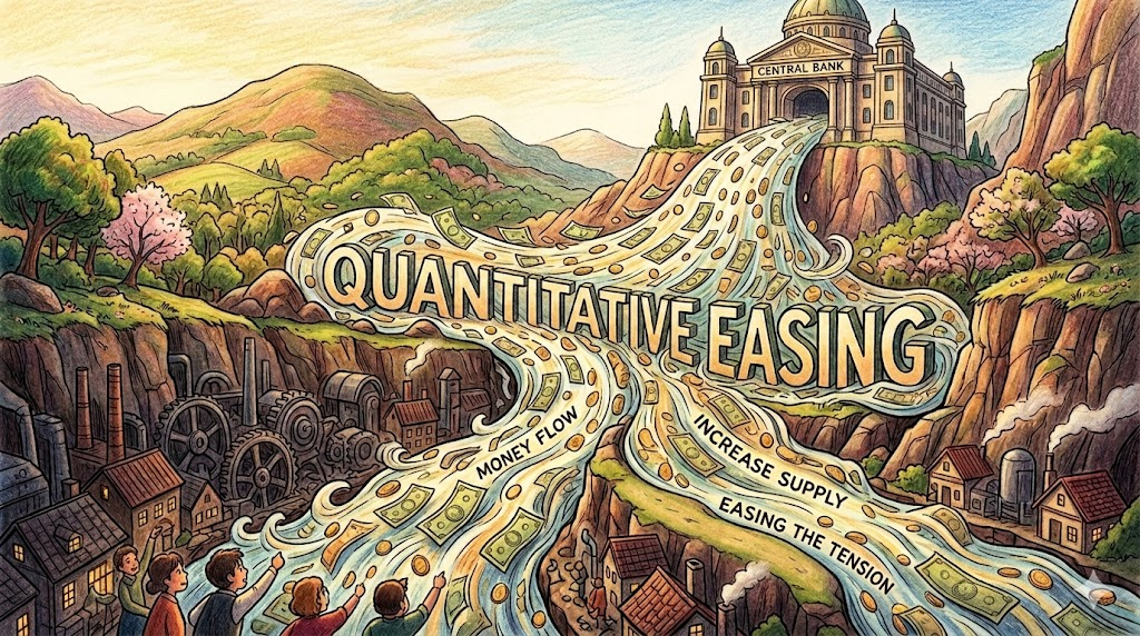 뉴스나 경제 기사에서 아주 자주 등장하는 전문 용어입니다. 'quantitative(양적인)'와 앞서 배운 'easing(완화, 풀어줌)'이 결합된 단어입니다. 금리를 낮추는 일반적인 방법만으로는 경제가 살아나지 않을 때, 중앙은행이 직접 시장에 개입하여 국채 등 자산을 사들이고 시중에 돈의 '양'을 엄청나게 풀어서(ease) 자금 융통을 원활하게 만들어주는 극약 처방을 뜻합니다. 꽉 막힌 경제의 숨통을 트이게 해준다는 점에서 'ease'의 뉘앙스가 아주 잘 살아있습니다. 줄여서 'QE' 라고도 부릅니다.