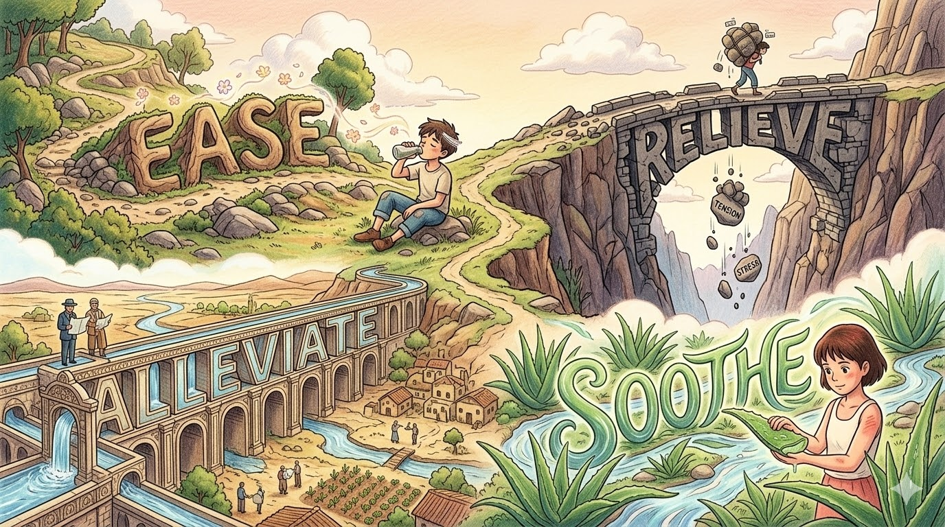 유의어 비교: 고통이나 긴장을 '줄이다, 완화하다'를 뜻하는 동사들 (Ease vs. Relieve vs. Alleviate vs. Soothe)