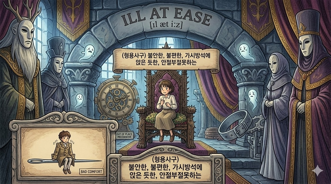 - ill at ease: ease(편안함) 앞에 ill(나쁜)이 붙어, 어색하거나 긴장되어 심리적으로 '불편한(불안한)' 상태를 뜻합니다.