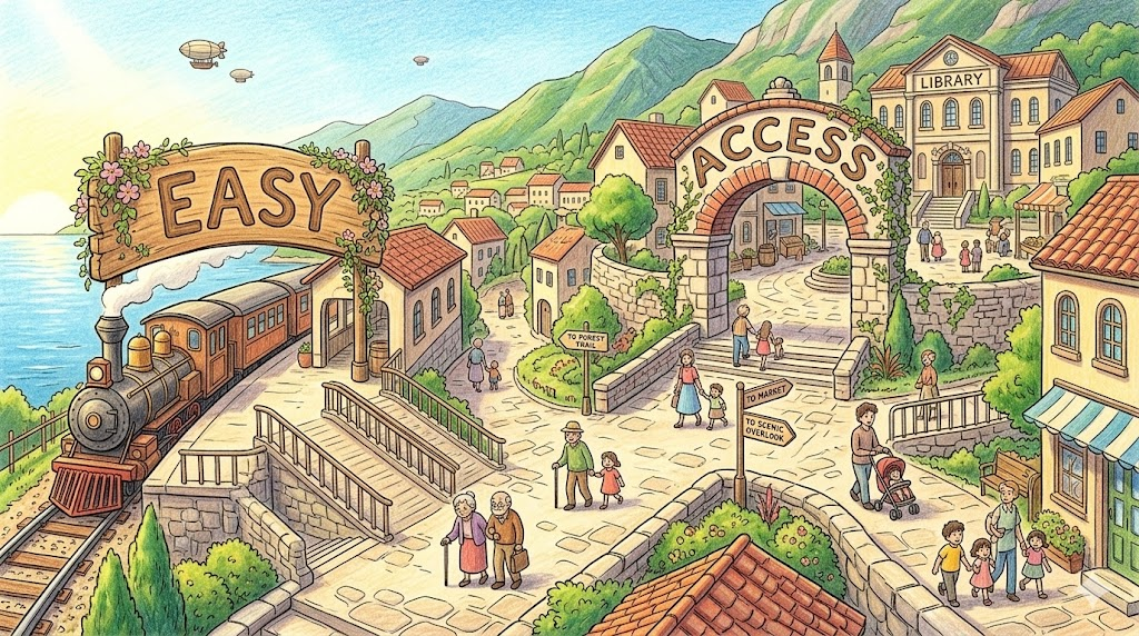 특정 장소, 정보, 서비스 등에 도달하거나 이용하는 과정에 장애물이 없고 아주 편리하게 열려있는 상태를 뜻합니다. 부동산 광고에서 "지하철역 접근성이 좋다"고 할 때나, 웹사이트가 "누구나 정보에 쉽게 접근할 수 있다"고 홍보할 때 빠지지 않는 실용적인 비즈니스 및 일상 표현입니다.