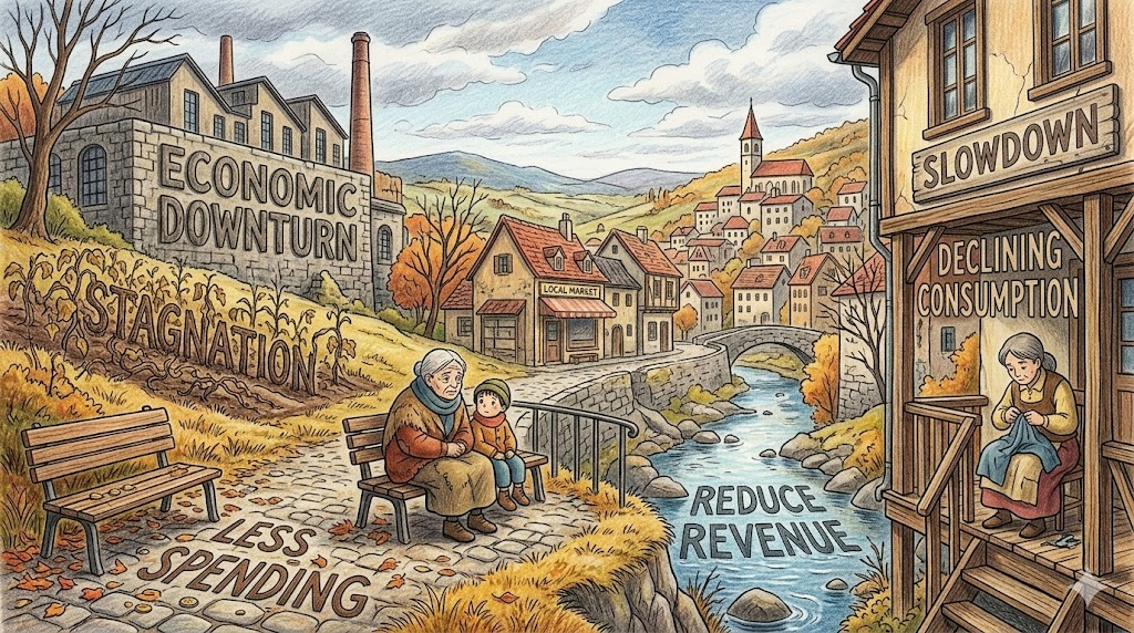 | economic downturn | 중간 (하강 추세) | 경제 활동의 전반적인 둔화 | 기온이 점점 떨어지는 계절 변화 |