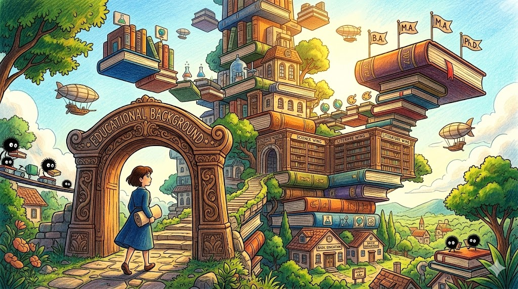 입사 지원이나 공식적인 프로필에서 그 사람이 어디서, 어떤 수준의, 무슨 전공의 교육을 받아왔는지를 전체적으로 아우르는 표현입니다. 단순히 졸업한 학교 이름뿐만 아니라, 학위의 종류나 이수한 교육 과정 전체의 역사를 뜻하는 격식 있는 비즈니스 및 이력서 용어입니다.