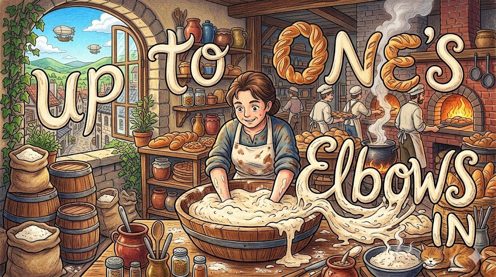 up to one's elbows in [ʌp tu wʌnz ˈelboʊz ɪn]