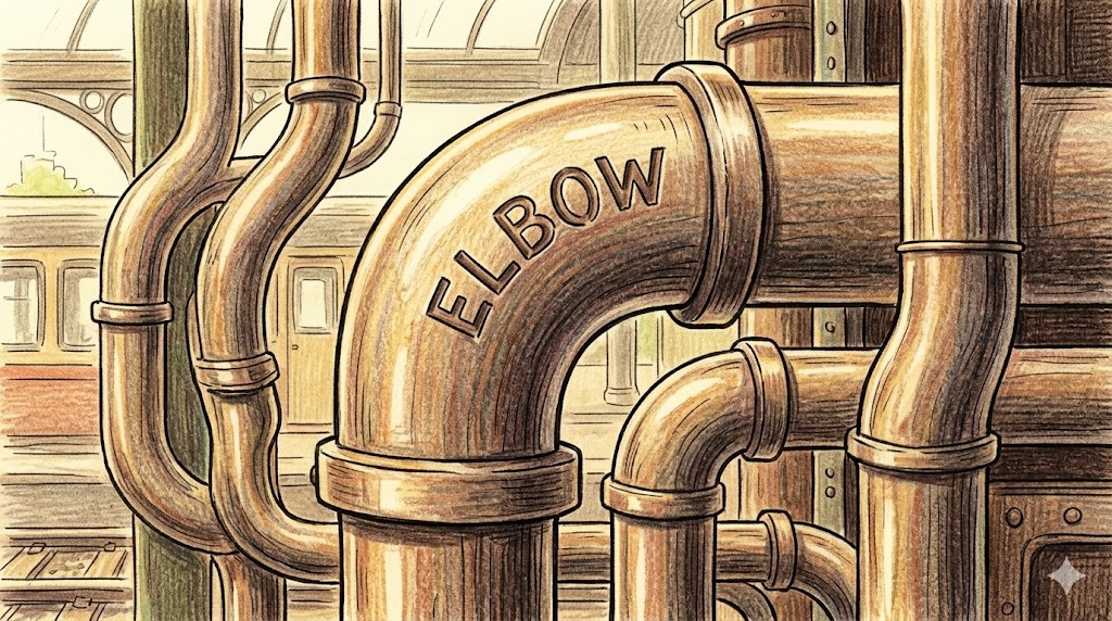 | 종합 뉘앙스 | (1) 다치면 찌릿한 '팔꿈치'. (2) 만원 지하철에서 '밀치고 나가기'. (3) 수도관의 '엘보 연결관'. | '꺾이는 지점이자 공간을 만드는 도구' |