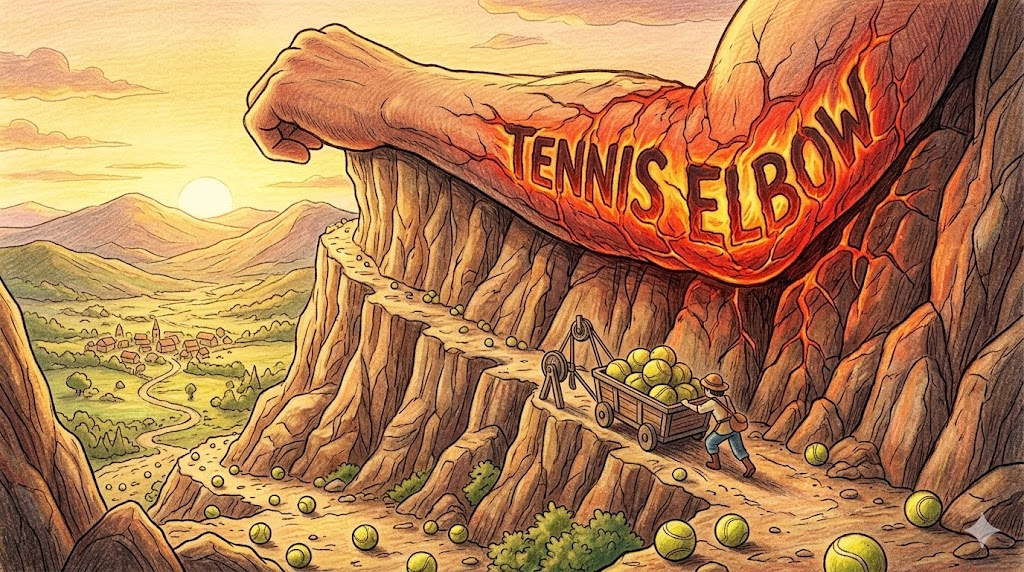 - 해석: (의학/일상) 테니스, 골프, 혹은 집안일 등으로 인해 팔을 무리하게 사용하여 팔꿈치 바깥쪽 힘줄에 염증과 통증이 생기는 아주 흔한 질환의 통칭입니다.