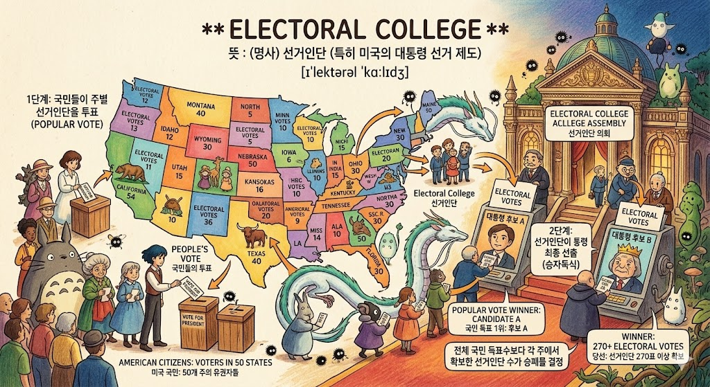 - 해석: (미국 정치 배경지식) 미국의 대통령 선거에서 국민들이 직접 대통령을 뽑는 것이 아니라, 각 주를 대표하는 '선거인단'을 뽑아 그들이 대통령을 선출하게 하는 독특한 간접 선거 제도입니다.