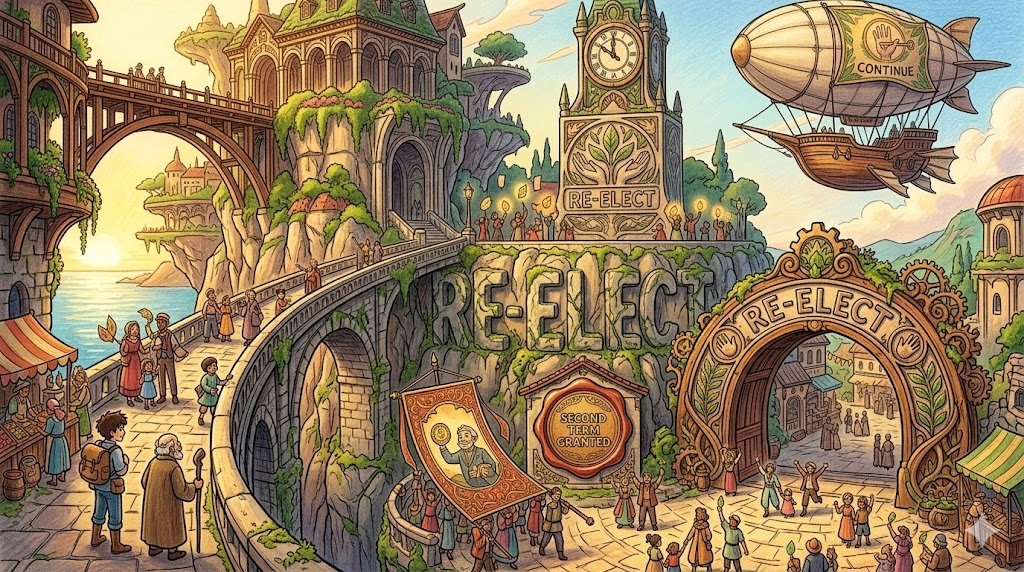- 해석: 현재 직무를 수행 중인 사람을 다음 임기에도 일을 하도록 다시 투표하여 뽑는 것을 말합니다.