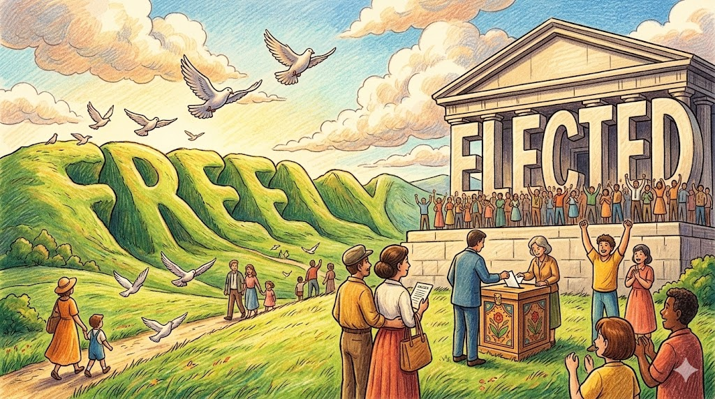 - 해석: 외부의 압력이나 부정행위 없이 민주적인 절차에 따라 공정하게 선출된 상태를 강조합니다.