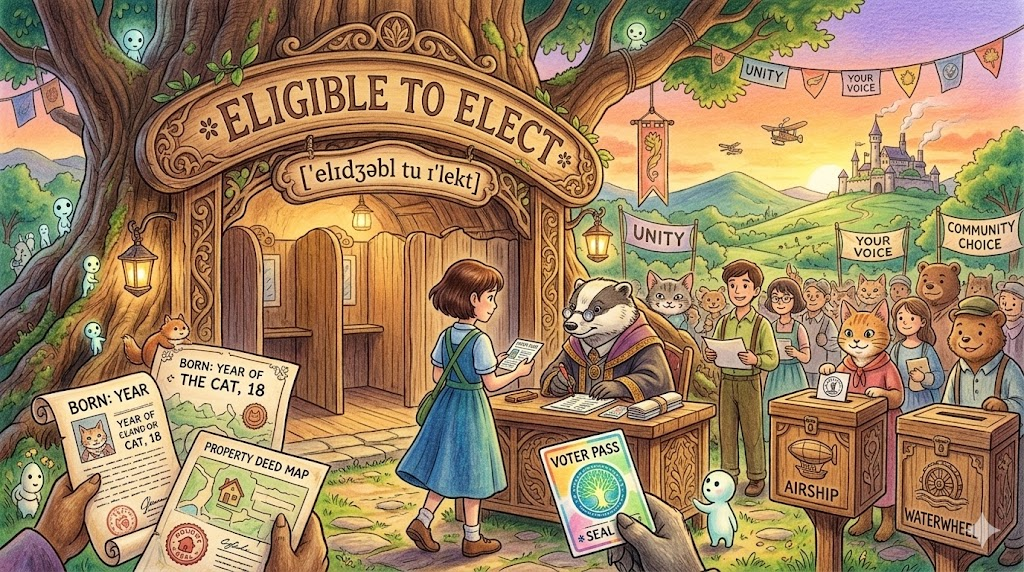 - eligible to elect: 법적으로 투표할 수 있는 나이나 자격을 갖추어 '선거권이 있는' 상태를 뜻합니다.