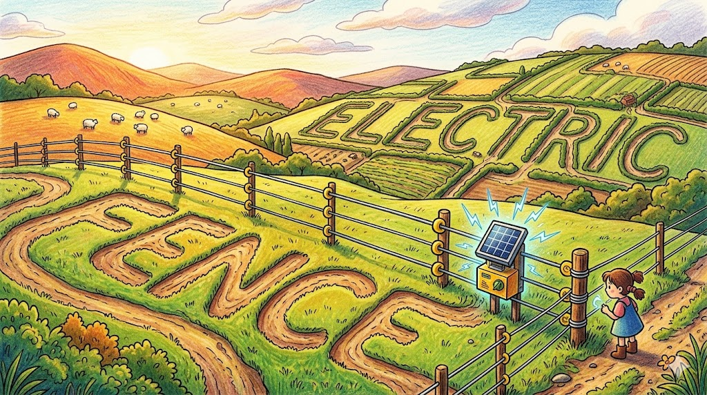 가축이 밖으로 나가는 것을 막거나 야생 동물 또는 무단 침입자의 진입을 방지하기 위해 전류를 흐르게 만든 울타리입니다. 접촉 시 불쾌하지만 위험하지 않은 수준의 충격을 주어 경고하는 용도로 쓰이며, 농장이나 보안 구역의 물리적 장벽을 상징합니다.