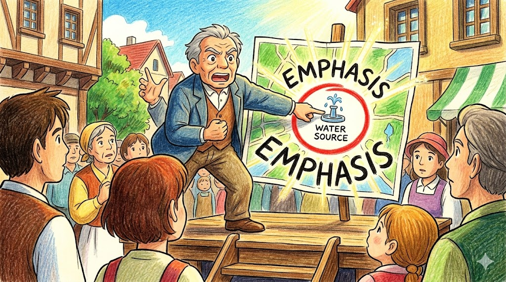 활용 팁: Emphasis는 명사입니다. "강조하다"라는 행동을 말하고 싶을 때는 동사인 Emphasize를 사용하세요. (예: Put emphasis on = Emphasize)