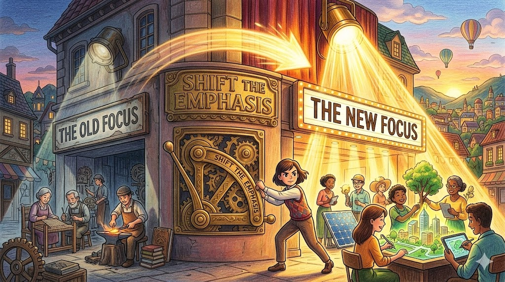 - shift/change the emphasis: 기존에 중요하게 생각하던 것에서 다른 것으로 '초점을 이동'시키는 것을 의미합니다.