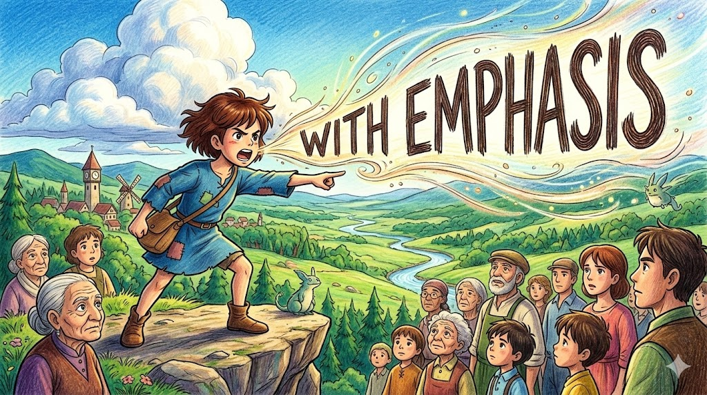 (부사구/명사) 강조하며(힘주어), 지나친 강조(과잉 강조)