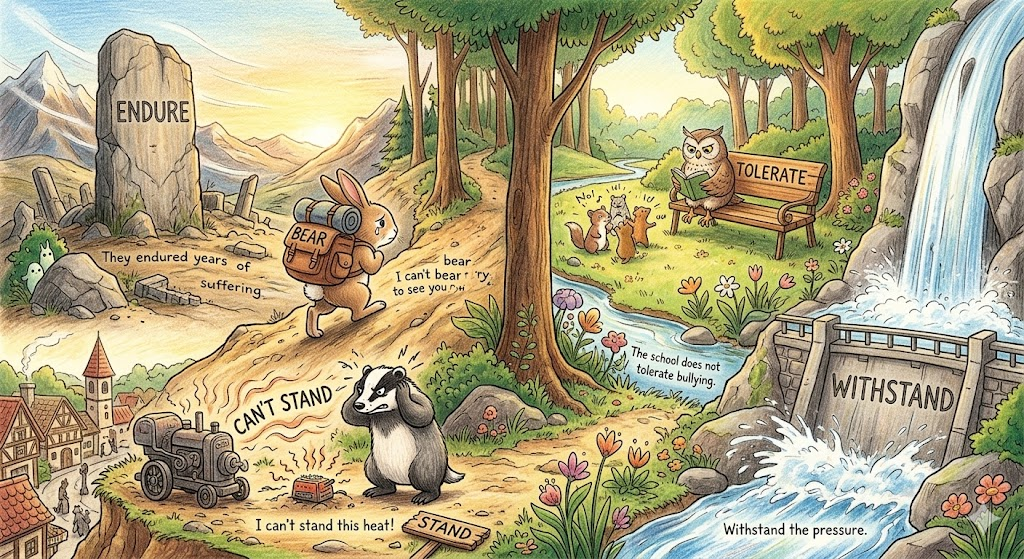 - 타동사 (견디다): 뒤에 사람, 고통, 상황 등 목적어가 오면 묵묵히 "참고 버티다(Tolerate / Bear)"로 해석합니다.
