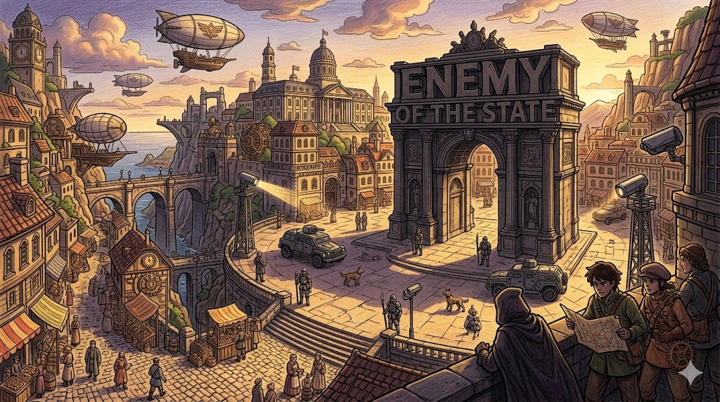 | enemy of the state | 국가 체제 | 국가 존립을 위협하는 반역자·스파이에게 붙는 공식적 낙인 |