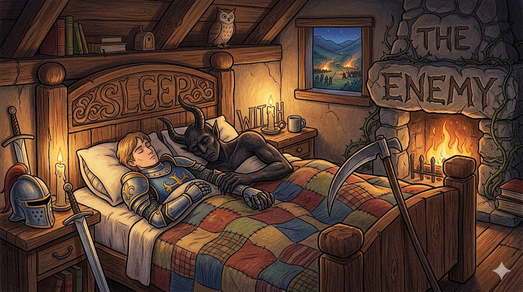 자신에게 해를 끼칠 수 있는 위험한 적대 세력과 협력하거나 친밀한 관계를 유지하는 아이러니하고 위험한 상황을 묘사합니다. 배신·타협·위험한 동맹을 비유할 때 쓰이는 강렬한 관용구입니다.
