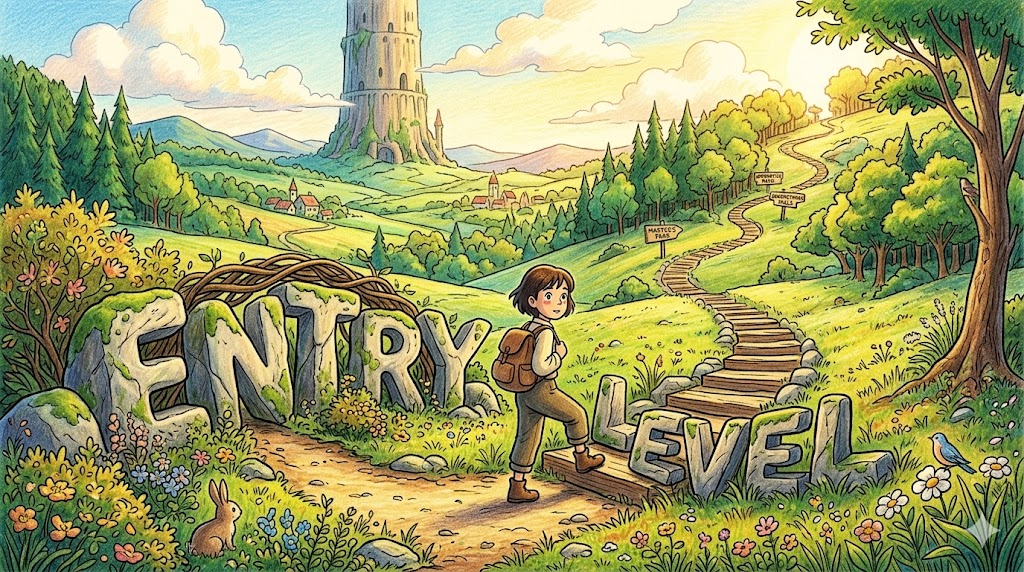 어떤 분야나 직업에 처음 진입하는 가장 기초적인 단계를 뜻합니다. 경험이 없는 초보자가 새로운 영역에 첫발을 내딛는 시작점의 이미지가 핵심입니다.
