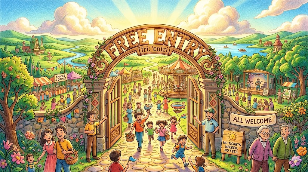 비용 없이 무료로 입장하거나 참가할 수 있는 것을 뜻합니다. 진입 장벽이 없다는 개방성과 접근성의 이미지가 핵심입니다.