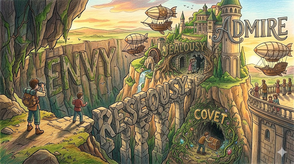 envy는 단순한 질투가 아니라, 남이 가진 것을 향해 욕망과 결핍감을 담아 강렬하게 바라보는 감정이다 — 그것이 나를 더 나아지게 하는 동기부여의 불씨가 될지, 남을 깎아내리는 파괴적 시기심이 될지는 그 시선을 어디로 향하느냐에 달려 있다.