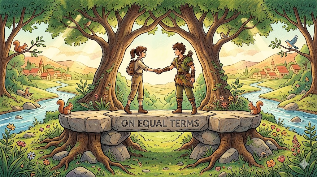on equal terms [ɒn ˈiːkwəl tɜːrmz]