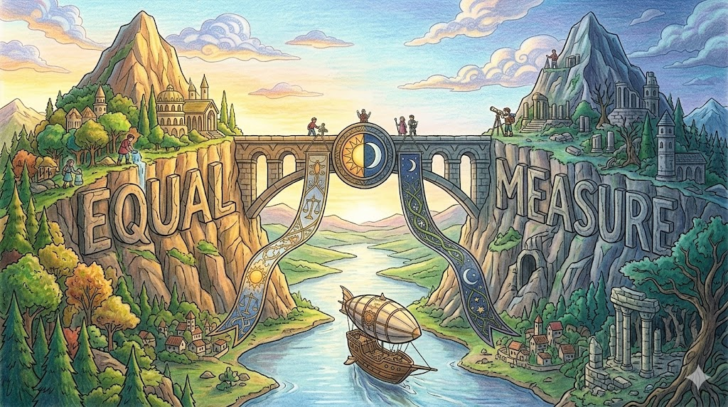 - equal measure: 두 가지 이상의 것이 똑같은 정도나 비율로 존재하는 것.