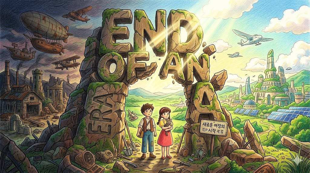 하나의 시대가 완전히 끝나고 새로운 시대로 전환되는 결정적 순간을 뜻합니다. 단순한 마무리가 아닌 의미 있는 역사의 완전한 종결이라는 묵직한 감정을 담습니다.