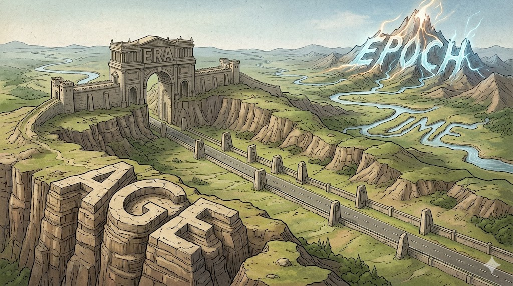 단순한 '시간(time)'이나 '기간(period)'과 달리, "어떤 두드러진 특성·사건·인물로 정의되고 다른 시간과 뚜렷하게 구분되는 역사의 한 완결된 단위" 를 담고 있습니다. era가 쓰이는 순간, 그것은 단순히 시간이 흘렀다는 것이 아니라 "이 시간은 다른 시간과 달리 이것으로 정의된다" 는 역사적 선언입니다.