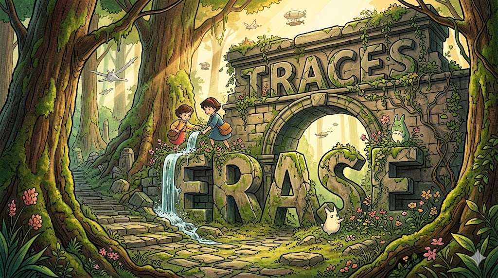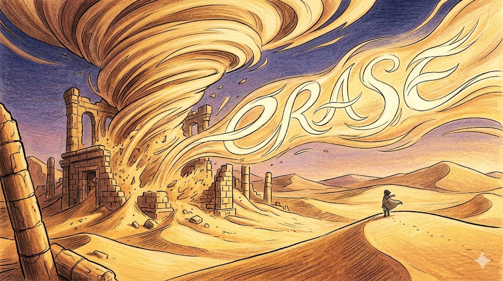 단순한 '없애다(remove)'나 '삭제하다(delete)'와 달리, "표면을 긁어내어 그 위에 있던 것의 흔적 자체를 완전히 사라지게 하는" 완전한 제거의 이미지를 담고 있습니다. erase가 쓰이는 순간, 그것은 단순히 가리거나 옮기는 것이 아니라 "그것이 거기 있었다는 사실 자체를 없애버리는" 근본적 소거입니다.