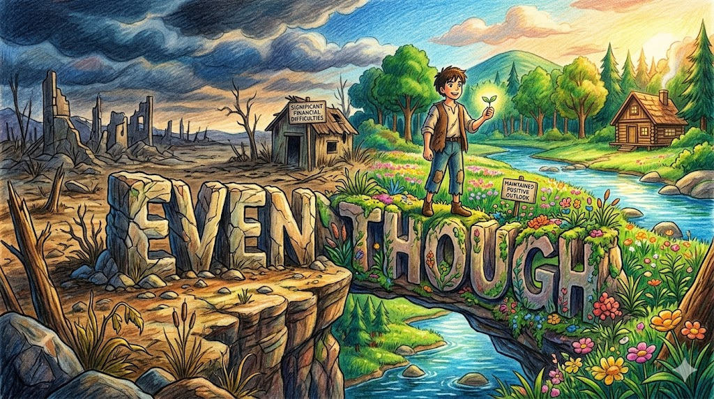 1. He maintained his positive outlook even though he faced significant financial difficulties. (그는 심각한 재정적 어려움에 직면했음에도 불구하고 긍정적인 시각을 유지했습니다.)