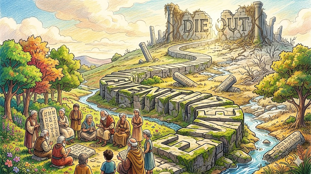 - eventually die out: 어떤 종·문화·관습 등이 시간이 흐르면서 결국 완전히 사라지다.
