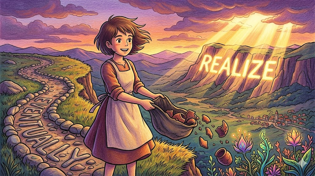 eventually는 단순한 "결국"이 아니라, 모든 과정과 사건들을 통과한 끝에 밖으로 나오듯 시간이 걸리더라도 모든 과정을 거쳐 반드시 도달하게 되는 필연적 완성을 담은 단어다 — eventually가 있는 곳엔 언제나 '오래 걸렸지만 결국 여기까지 왔다'는 필연의 순간이 있다.